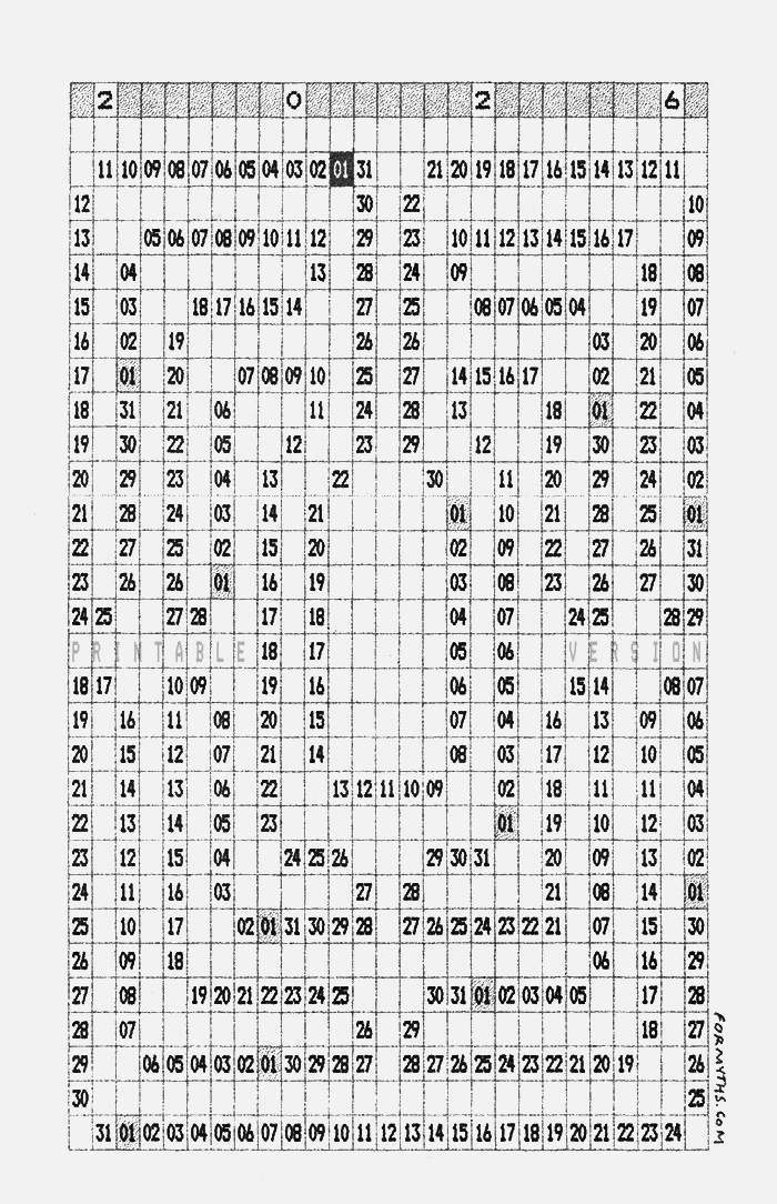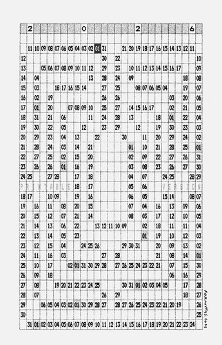 Printable version of my 2026 calendar. Scanned in from the risograph-printed version for full analog graininess. The dark "01" square is January 1 - follow the pattern and color in one square each day to see how much of the year has gone by.